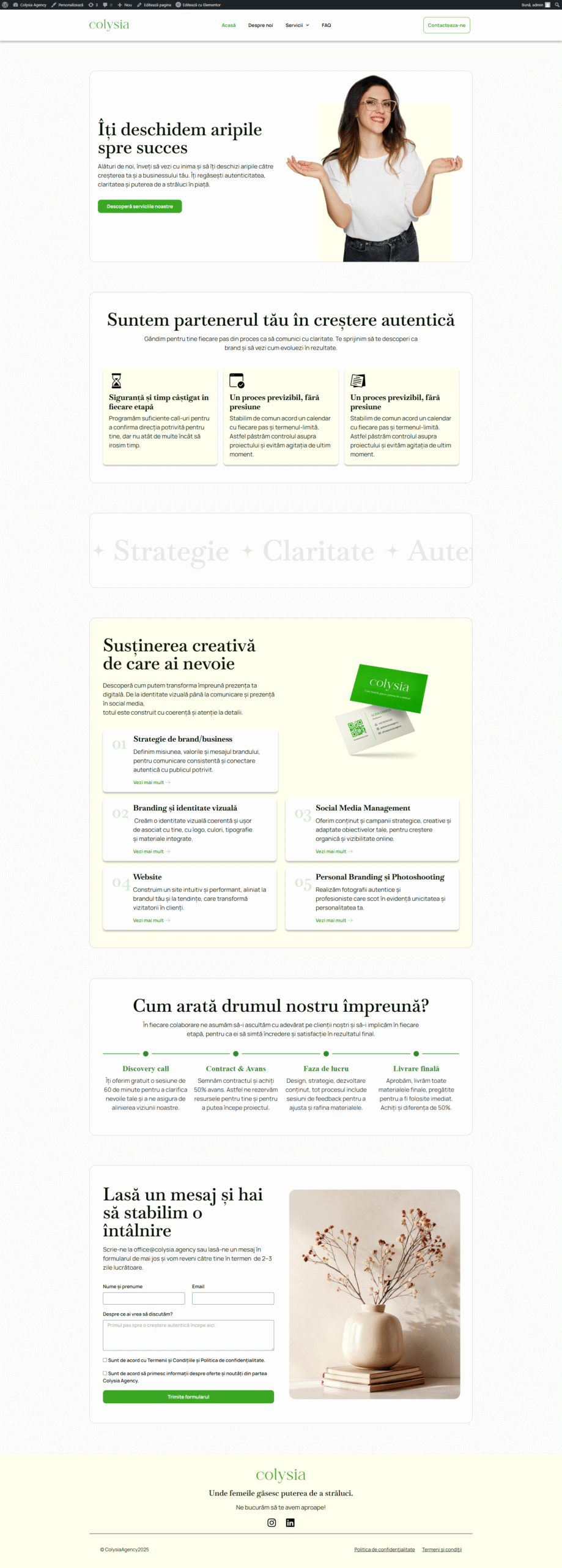 Colysia Agency este un brand modern dedicat femeilor care doresc să își dezvolte afacerea cu claritate, autenticitate și strategie. Website-ul a fost creat pentru a transmite încredere, profesionalism și o direcție clară de creștere, printr-un design aerisit, feminin, premium și orientat spre conversie.